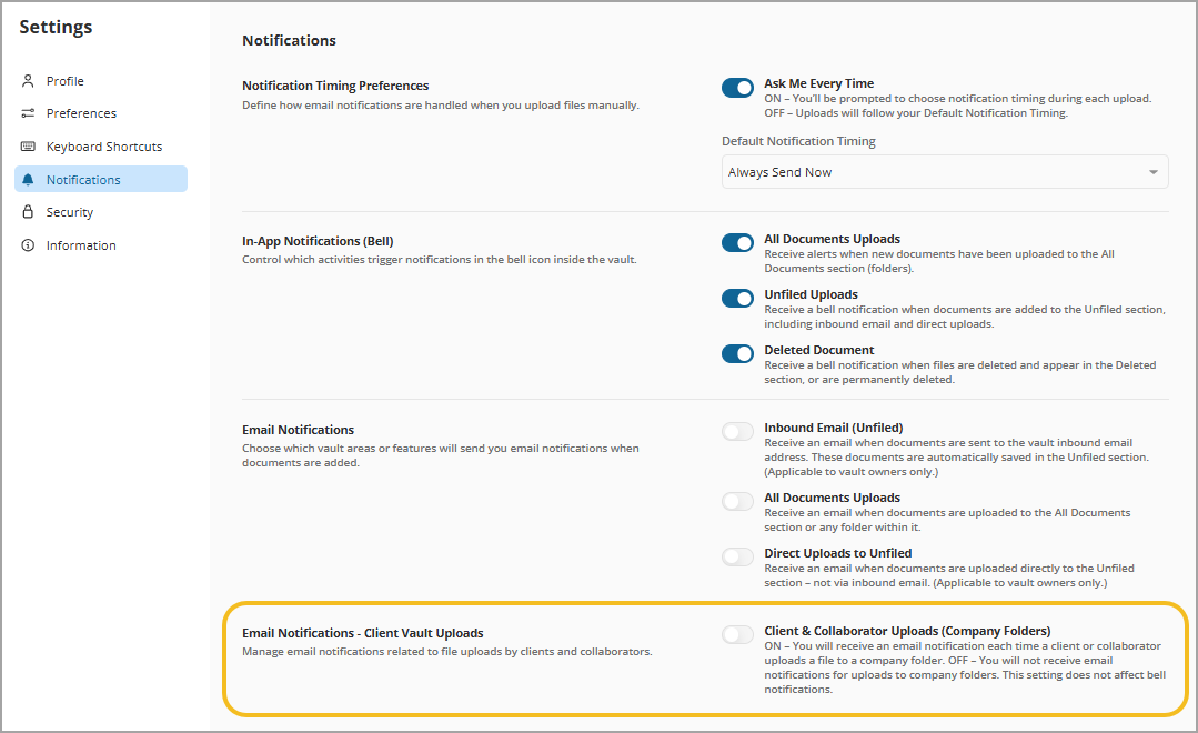 This guide explains how Administrative Users (admins & Reps) can manage whether they receive email notifications when clients or collaborators upload files inside a client vault.
